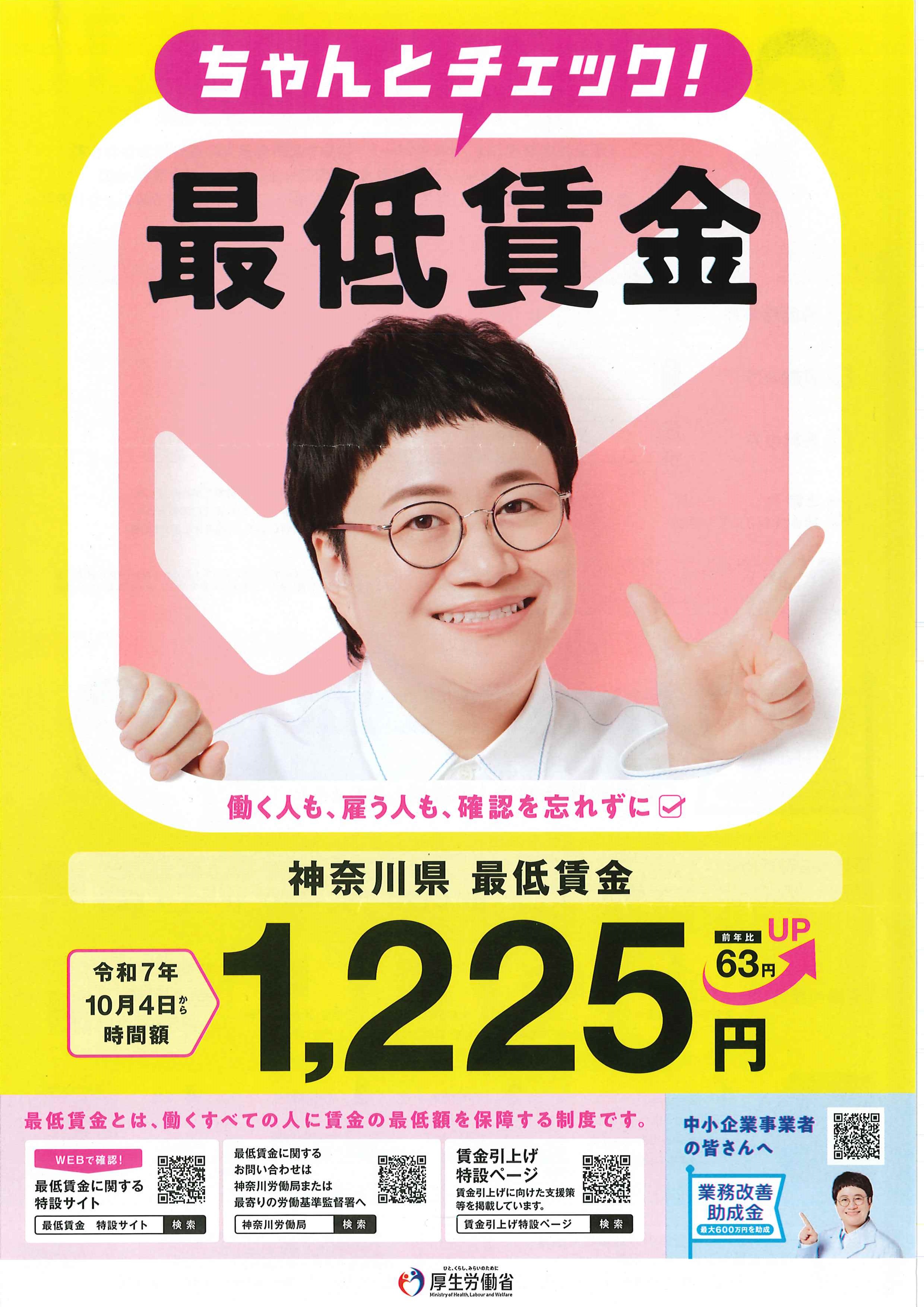 神奈川県の最低賃金は令和7年10月4日から、63円引き上げ「1,225円」となります。